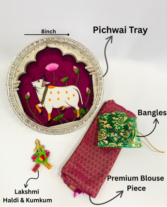 Celebrate the auspicious occasion of Varamahalakshmi Pooja with our elegant German Silver Pichwai Tray Gift Set, curated to reflect tradition, grace, and heartfelt gifting. This set is ideal for festive return gifting and pooja celebrations, bringing together timeless elements in a beautifully packed hamper.