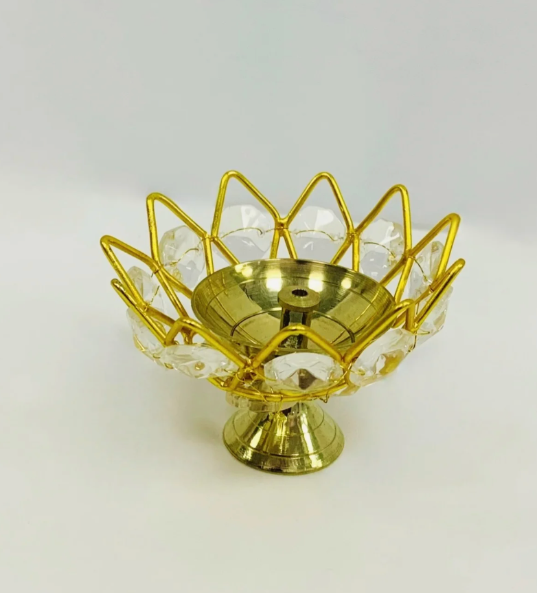 Brass Crystal Diya – Premium brass diya adorned with crystal elements, perfect for auspicious lighting rituals.