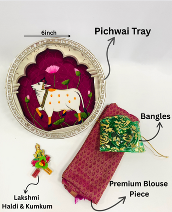 Celebrate the auspicious occasion of Pooja with our elegant German Silver Pichwai Tray Gift Set, curated to reflect tradition, grace, and heartfelt gifting. This set is ideal for festive return gifting and pooja celebrations, bringing together timeless elements in a beautifully packed hamper.